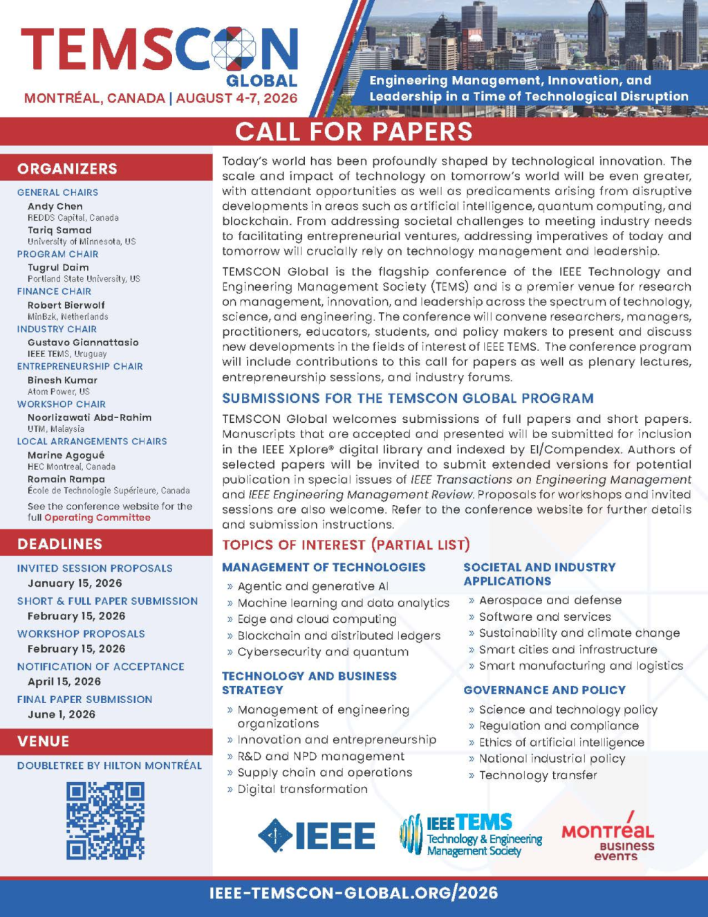 TEMSCON Global welcomes submissions of full papers and short papers. Manuscripts that are accepted and presented will be submitted for inclusion in the IEEE Xplore® digital library and indexed by EI/Compendex. Authors of selected papers will be invited to submit extended versions for potential publication in special issues of IEEE Transactions on Engineering Management and IEEE Engineering Management Review. Proposals for workshops and invited sessions are also welcome.
